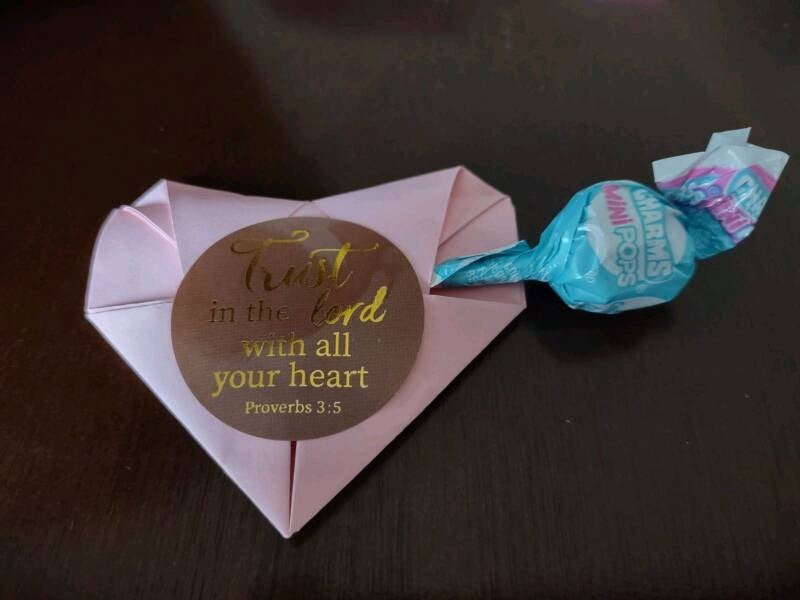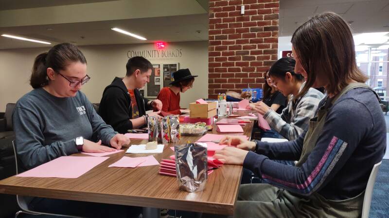 A last minute project crafted with leftovers hearts, candies, and bible verse stickers! Pierce Knepley, Hailey Kalinowsky, Lexi Ramerth, and other Across Generations members worked together to pass out approximately 60 notes to Dining Hall workers on the evening of Valentine's Day! Nothing goes to waste as we spread joy to everyone in the community.